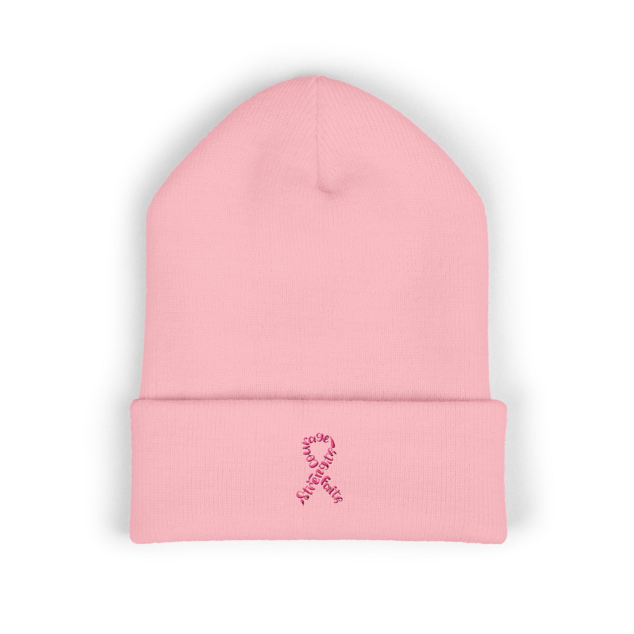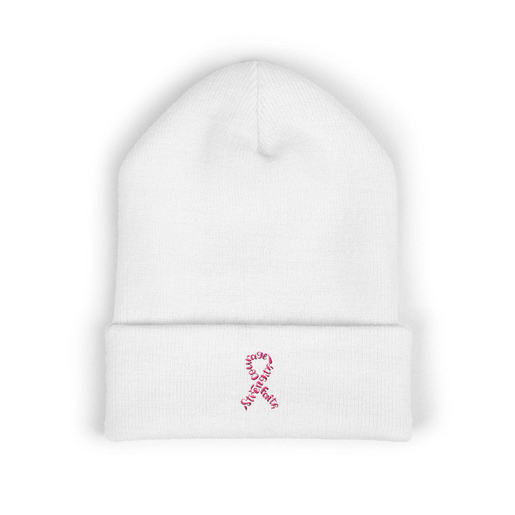 Keep your message of resilience front and center while staying cozy. The Breast Cancer Awareness Embroidered Beanie blends comfort with cause, featuring the iconic pink ribbon reimagined with powerful words—Courage, Strength, Faith. Soft, warm, and versatile, it’s the perfect cold-weather essential that carries meaning beyond style.