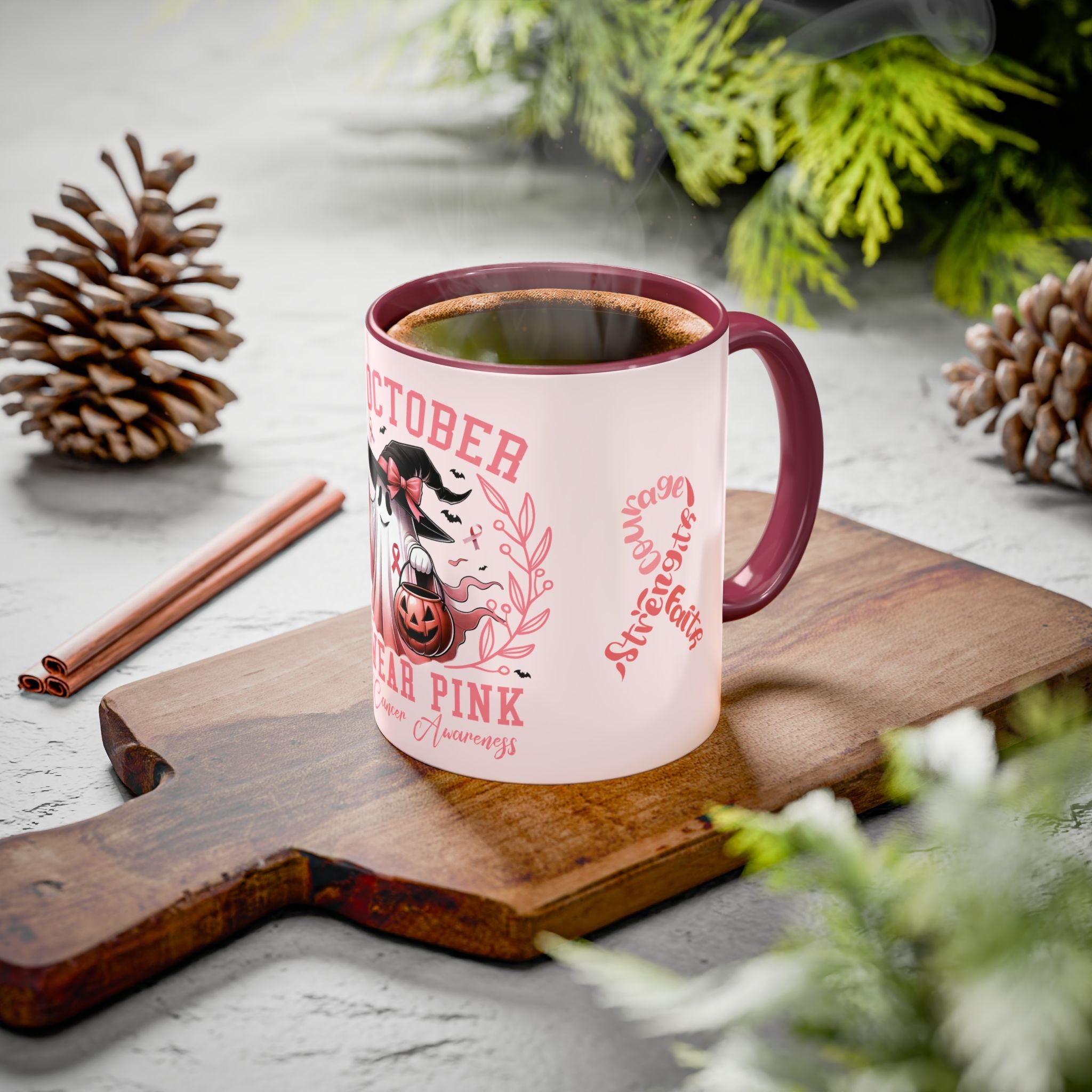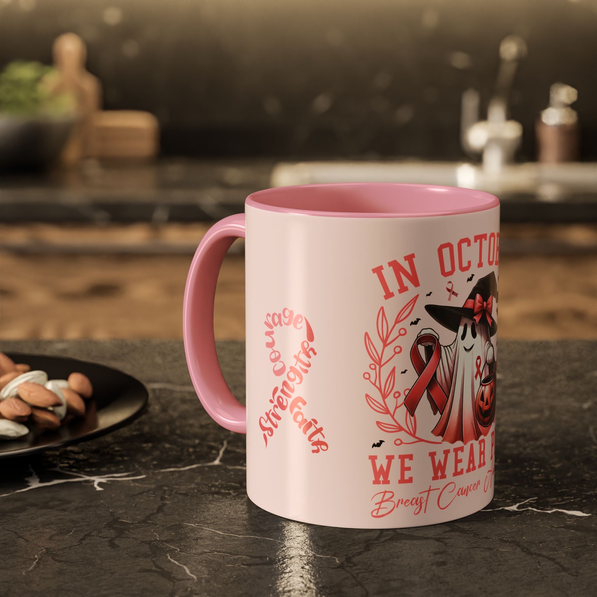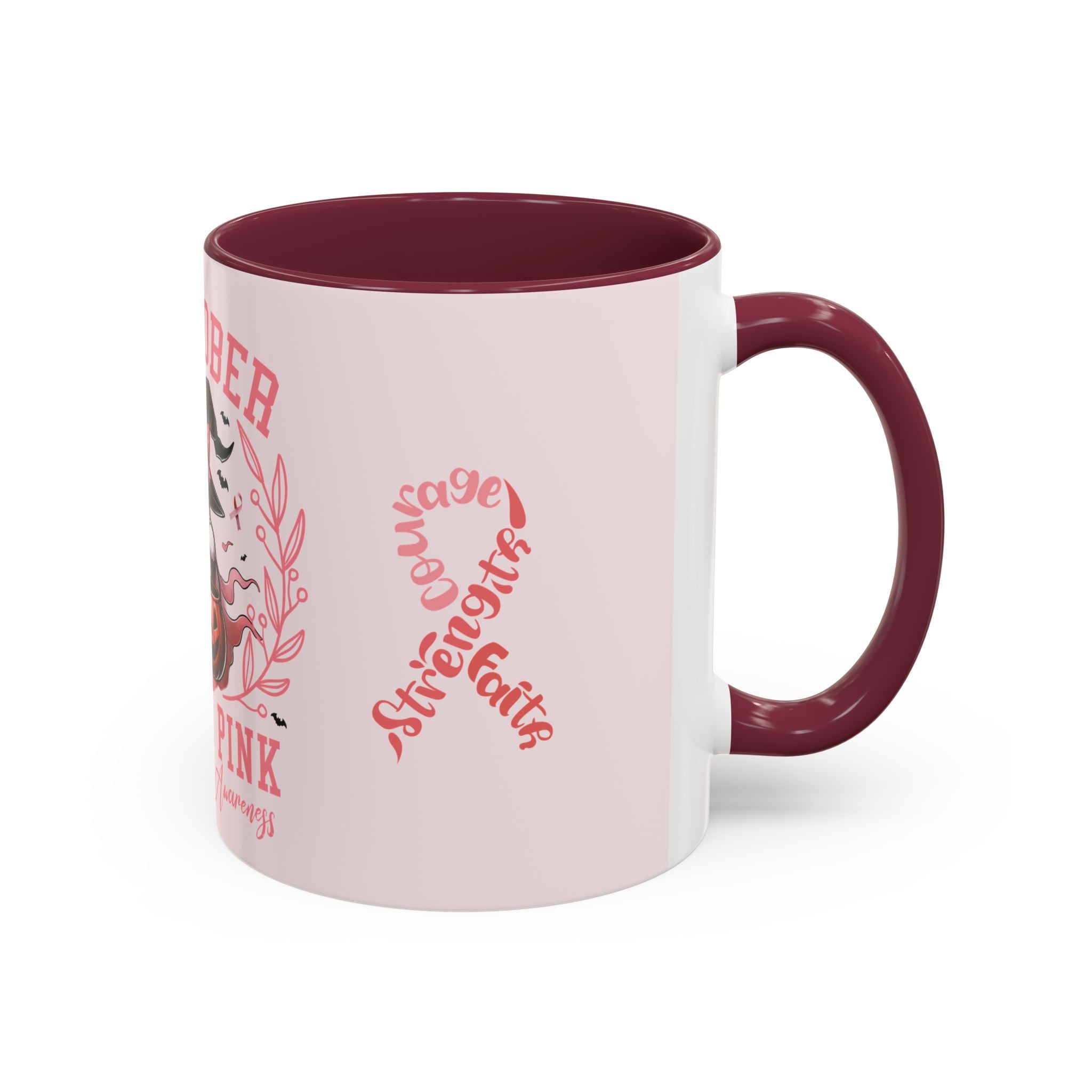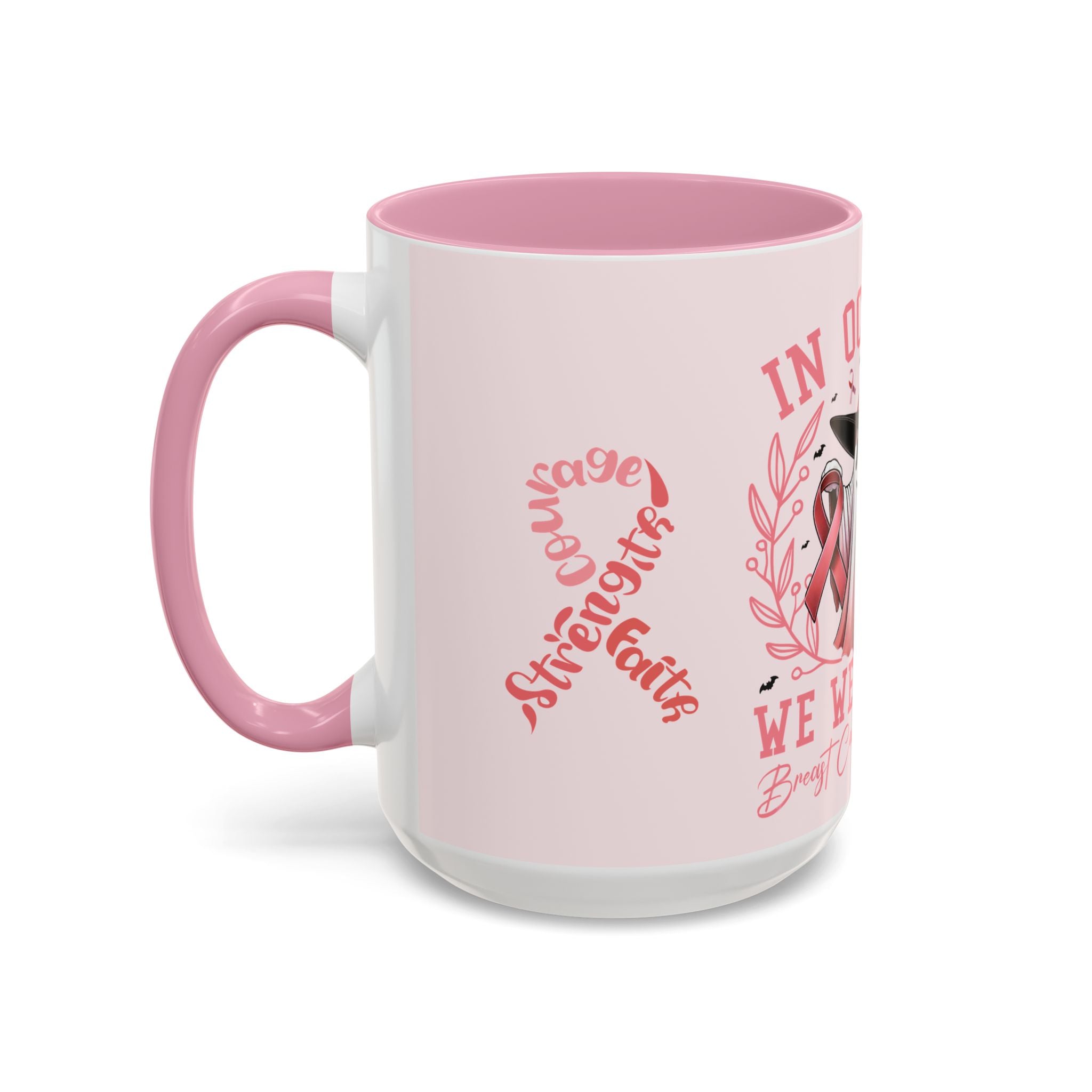 Sip with strength, pour with courage, and hold onto faith. This Colorful Breast Cancer Awareness Mug transforms your daily coffee or tea ritual into a moment of empowerment. Featuring the pink ribbon design with the words “Courage, Strength, Faith” alongside our exclusive “In October We Wear Pink” Halloween-inspired artwork, this mug blends awareness with seasonal charm. Every sip becomes a toast to resilience and hope.