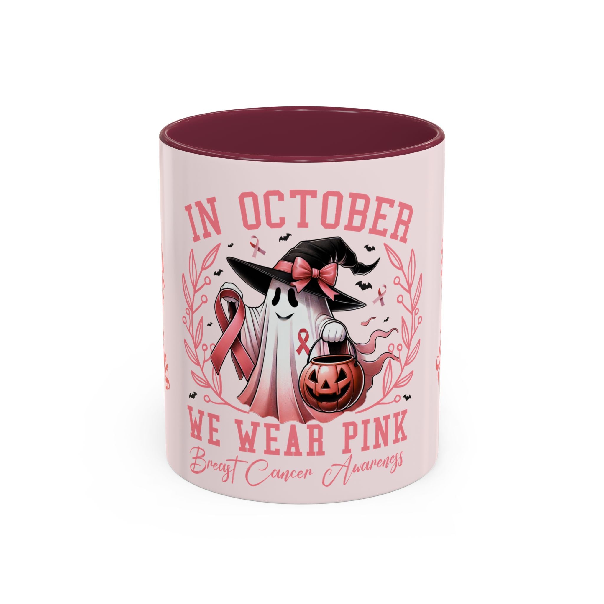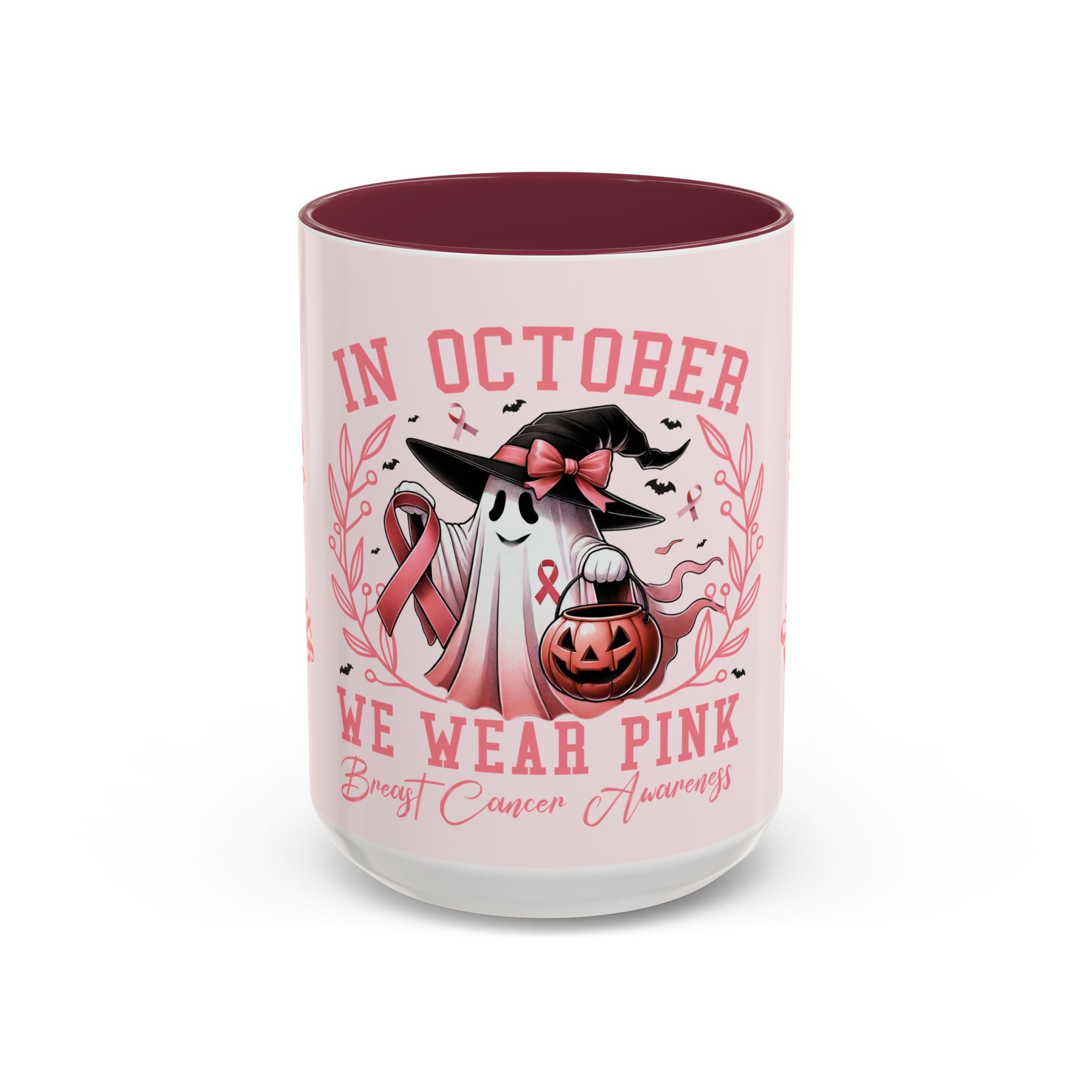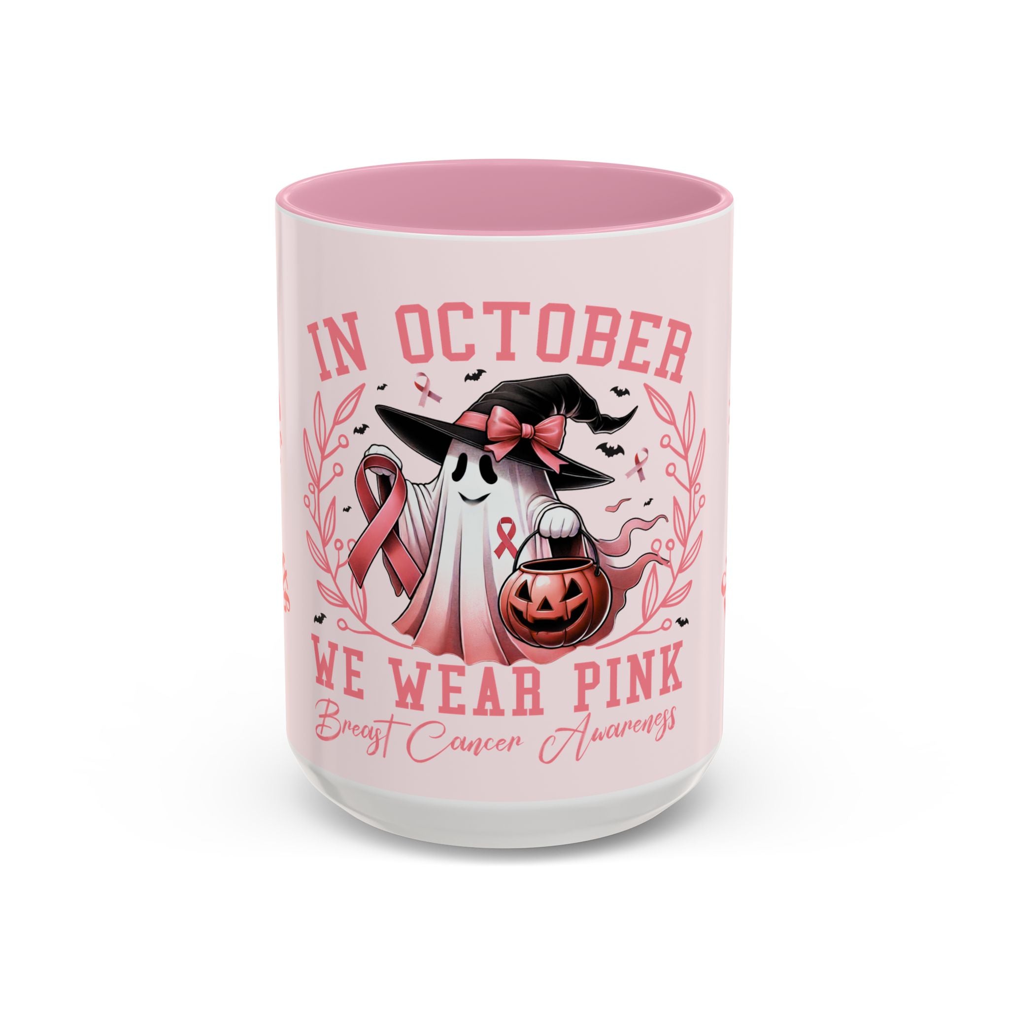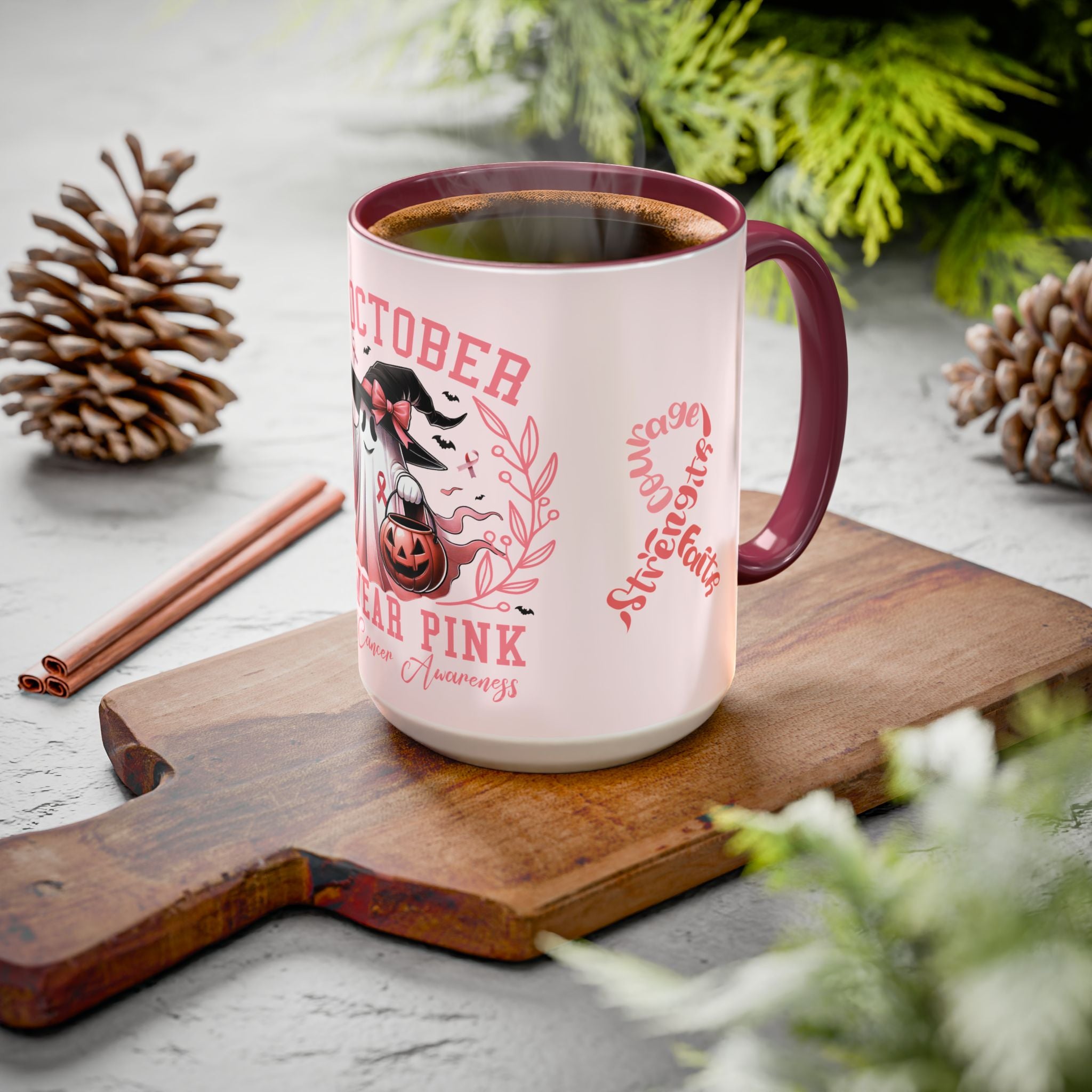 Sip with strength, pour with courage, and hold onto faith. This Colorful Breast Cancer Awareness Mug transforms your daily coffee or tea ritual into a moment of empowerment. Featuring the pink ribbon design with the words “Courage, Strength, Faith” alongside our exclusive “In October We Wear Pink” Halloween-inspired artwork, this mug blends awareness with seasonal charm. Every sip becomes a toast to resilience and hope.